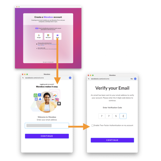 Either: Login using Google or Microsoft email. You will be prompted to sign-in and verify your account. Or, Create a Wavebox login. A verification code is sent to your email address for you to enter in the next window. No verification code? Check your spam/junk mail folder.