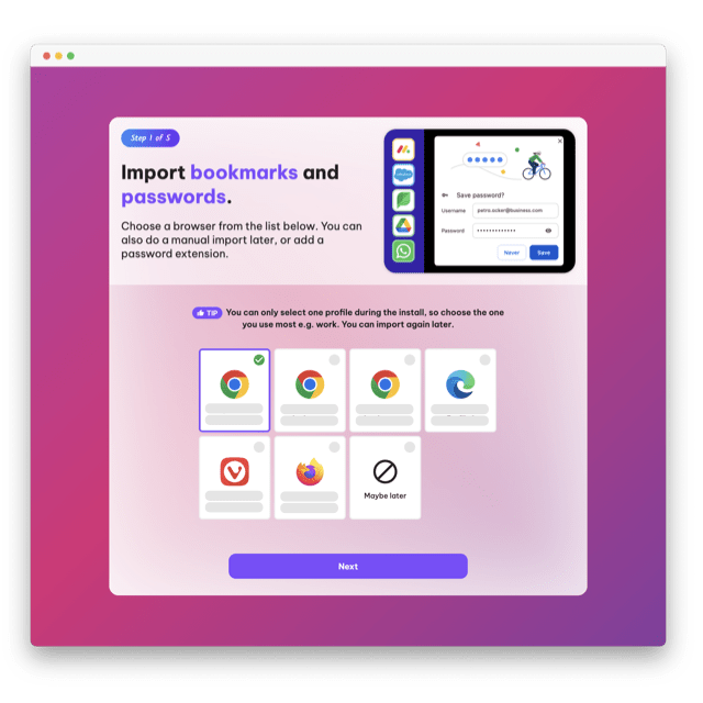 For a quick set up you can import bookmarks and passwords from your current browser (note that passwords never leave your machine). Or you can add a password extension and import passwords manually later.