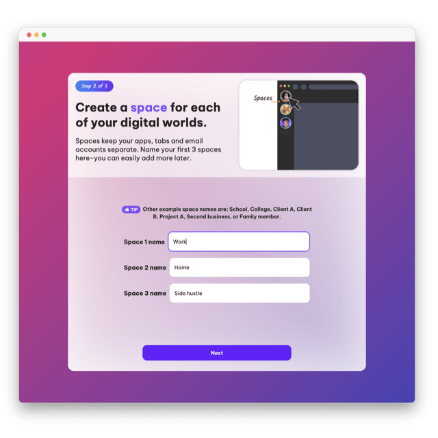 Spaces keep your digital worlds separate. You can create 3 here e.g. work, home, side hustle. You can change these and add more later.