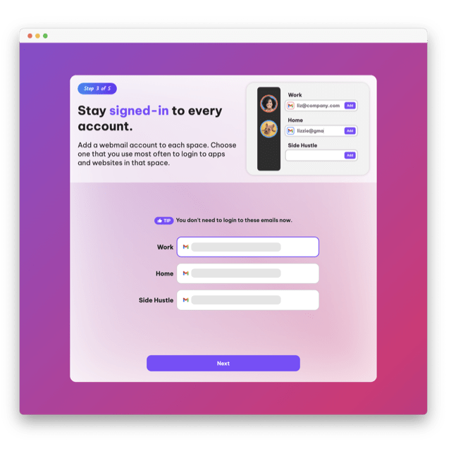 Assign an email address to each space so that you stay signed-in. Enter the email you use most to login to websites and apps in each space.