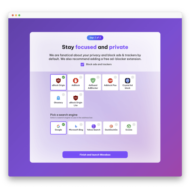 We reccomend adding an adBlocker extension such as UBlock Origin. You can also choose which search engine to power the address bar search. Click Finish.